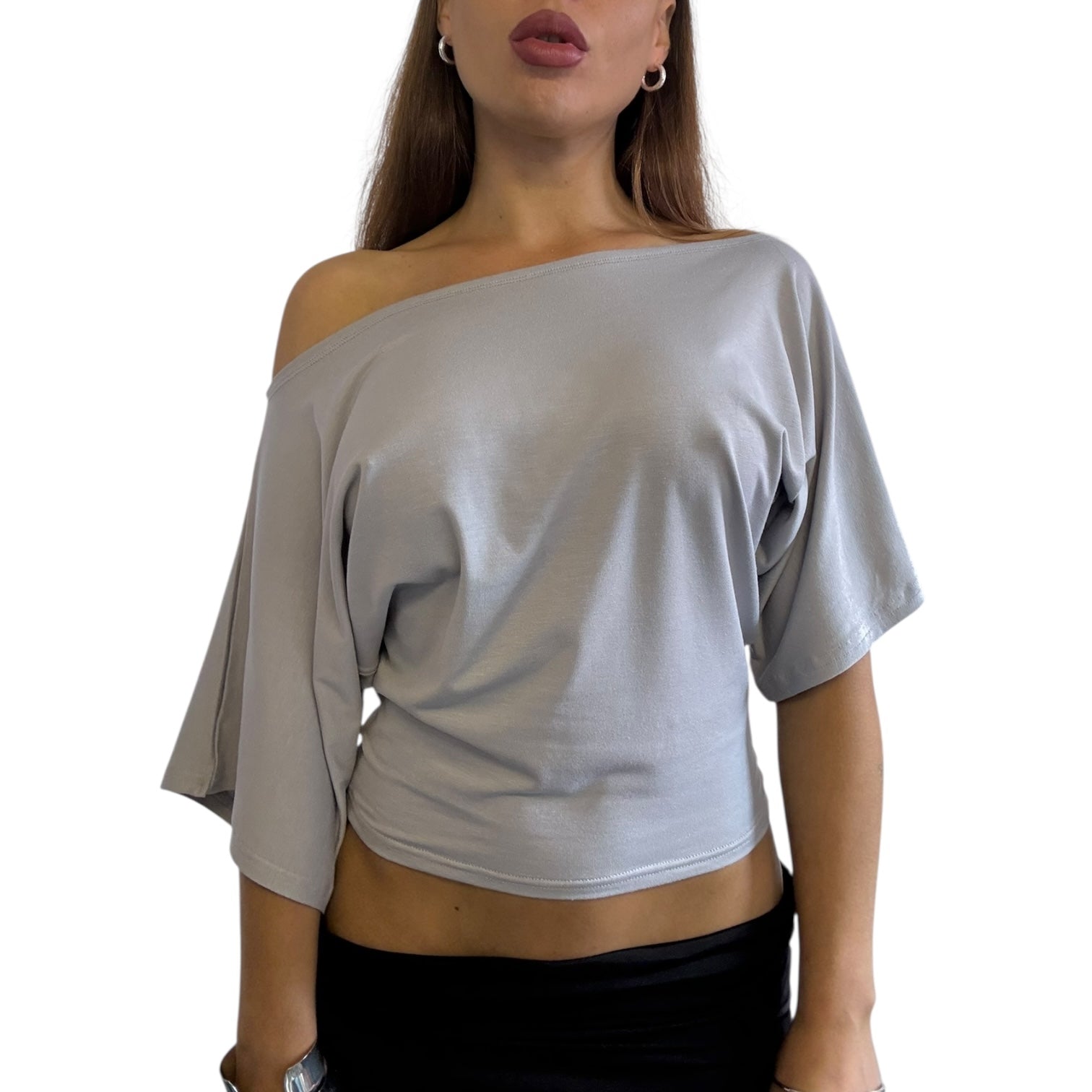 Made in bamboo jersey fabric, our Remy top features an off shoulder / batwing design. Model is wearing an XS.