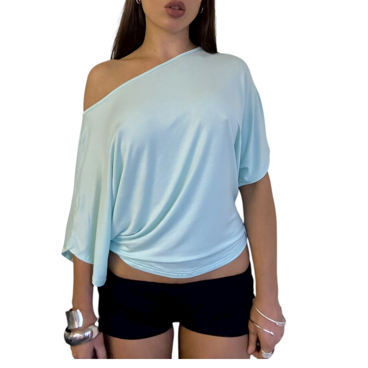 Made in viscose jersey fabric, our Demi top features an off shoulder / batwing design. Model is wearing an XS.