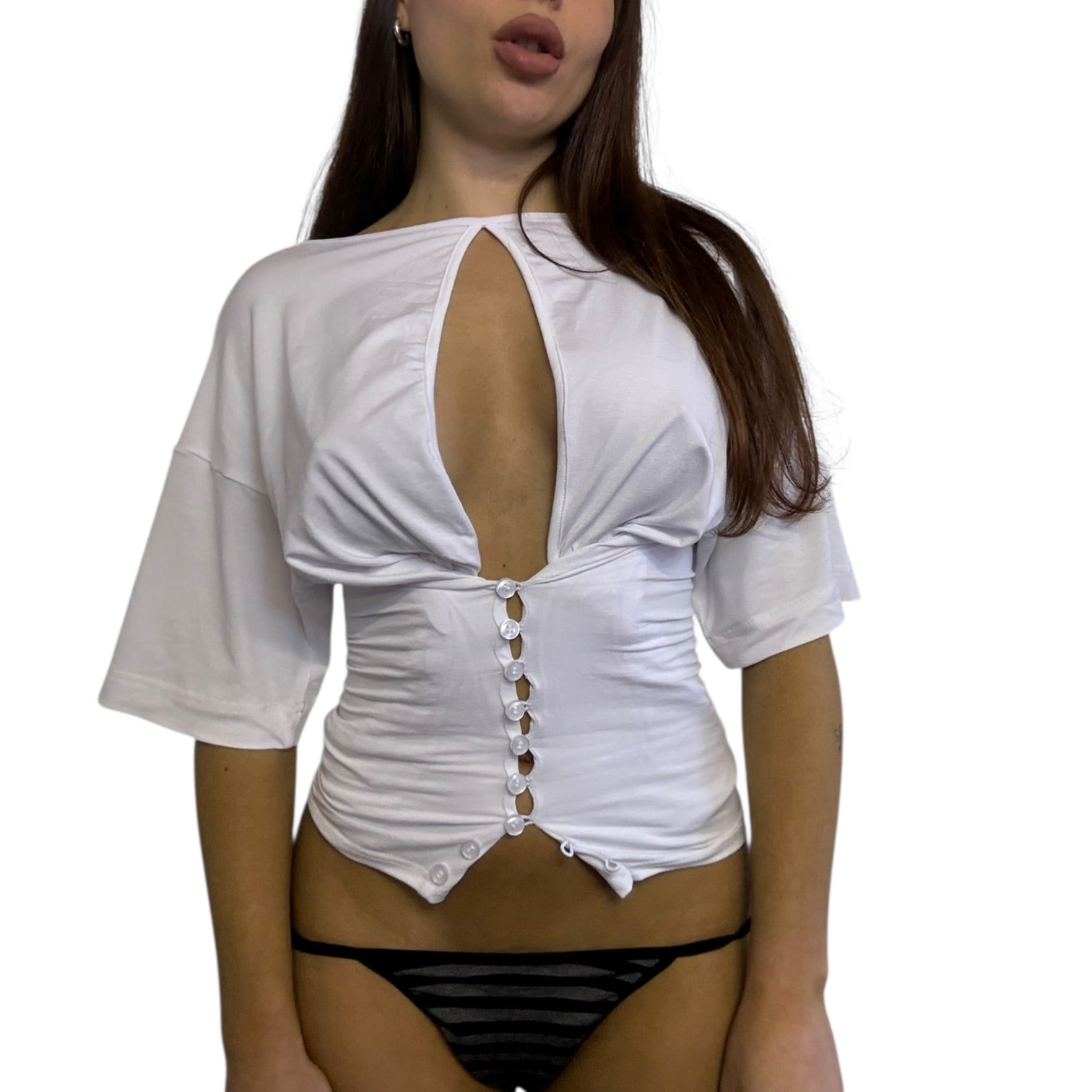 An oversized open-back tee with buttons down the side so you can wear it loads of ways. Style it straight, off-shoulder, twisted or reversed. Soft, stretchy jersey that drapes and shapes when buttoned.