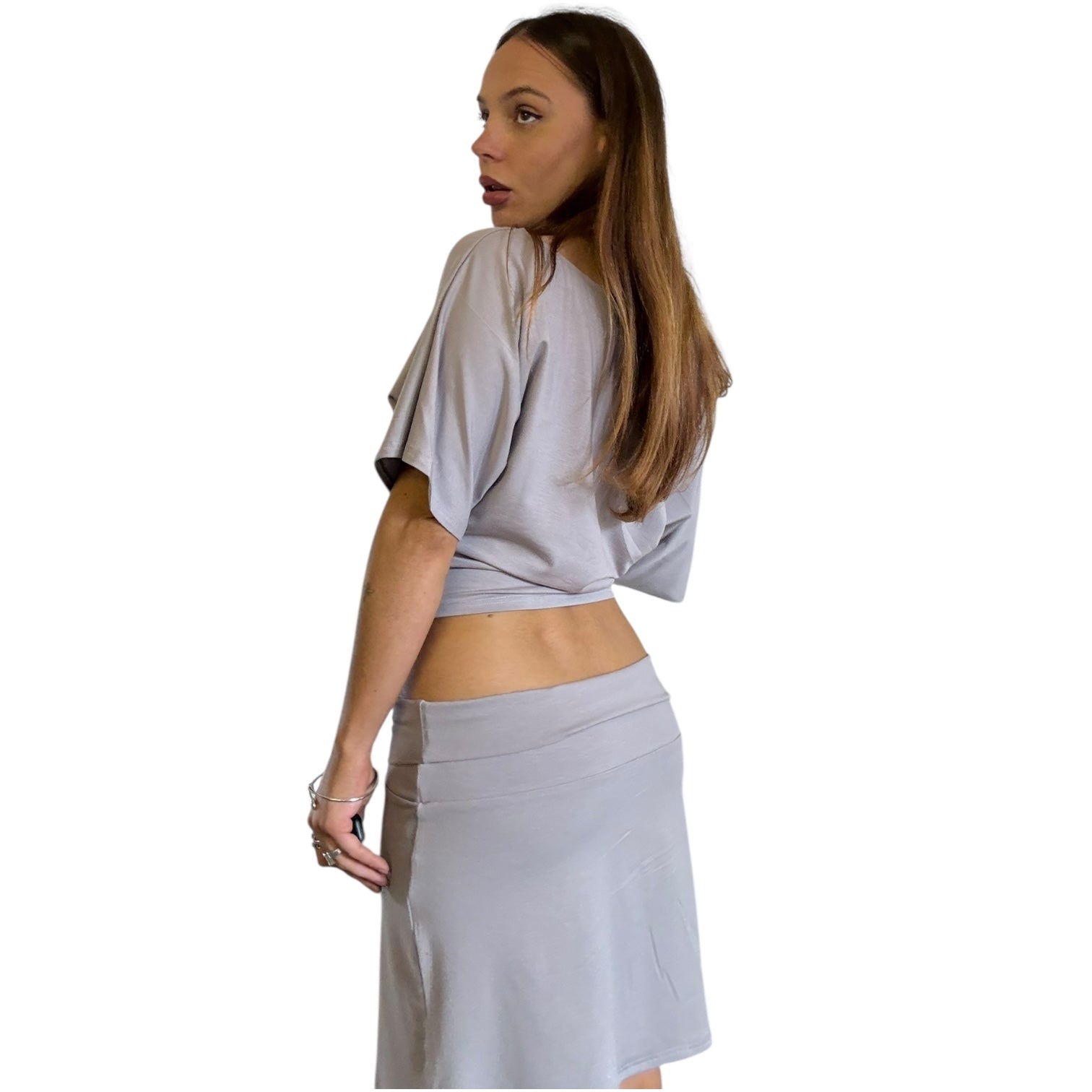 Features a thick waistband so can fold over for a shorter style/ design. A - line design.